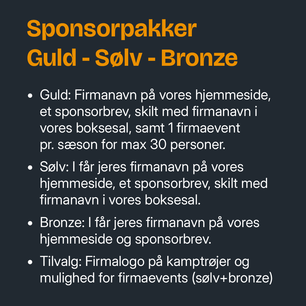 Vi søger efter sponsorer, som ønsker at hjælpe os med at optimere vores muligheder for at kunne tilbyde de helt rigtige boksefaciliteter til vores nuværende og kommende medlemmer, f.eks. ved at optimere vores udstyr, og tilskud til at deltage i stævner i hele Danmark og i de omkringliggende lande.